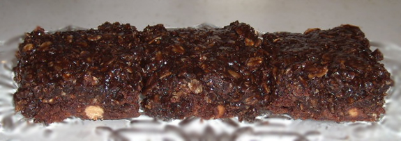 I combined a variation of this recipe for no-bake cookies with my brownie recipe to create some oh so yummy treats. They taste amazing! Must have more....peanut butter.....chocolate.....gimmie gimmie!